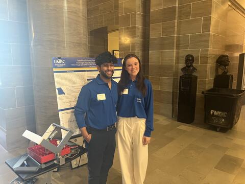 Nina Mitchell and Abhi Krovvidi traveled to Jefferson City to present their research at the Missouri State Capitol. Their poster, titled "Appetitive Olfactory Short-Term Memory Detection Utilizing Y-Maze Paradigm in Drosophila melanogaster" explains their work in adapting an appetitive olfactory long-term memory paradigm into a short-term assay. Additionally, they use an updated Y-maze and have adapted the assay to greatly improve the movement of flies into the decision arms of the apparatus. Implementing both short- and long-term memory paradigms in tandem can investigate memory-related processes over a span of time and help further advance the process of memory acquisition, short-term storage, and consolidation into long-term memory. We are proud of their hard work and representation of the Dissel Lab in front of Missouri's lawmakers!