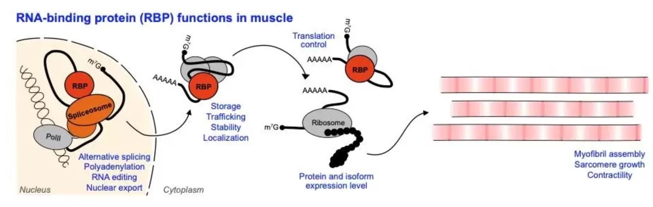 The Spletter lab studies how RNA regulation influences muscle development, as well as which RNA binding proteins (RBPs) are important for myogenesis. After a gene is transcribed, there are multiple regulatory steps that determine if a protein corresponding to that gene will be produced. The pre-RNA needs to be spliced, a process which often happens co-transcriptionally and can lead to the production of distinct splice isoforms through alternative splicing. pre-RNAs need to be tailed, capped and edited to mature them to mRNAs that can be exported from the nucleus. Once in the cytoplasm, mRNAs are trafficked to target destinations, for example to P-granules for storage or to different sub-cellular destinations. RNA binding proteins mediate these various regulatory steps, and ultimately determine the expression level of distinct splice isoforms of structural proteins that are available to assemble sarcomeres. RNA regulation therefore influences the morphology as well as the contractility of different muscle fiber types.
